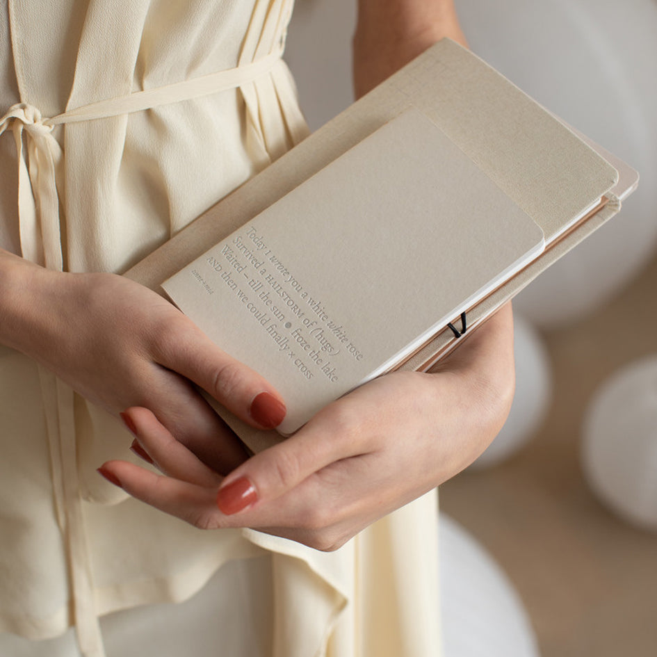 This A6 notebook (A6 notebook) is the perfect companion for on the go! With its handy size, it fits easily in your bag or pocket, so you can take notes anytime, anywhere. Printed on Japanese FSC paper, this notebook is a sustainable choice. The interior, with a soft gray dotted grid, offers a clear layout for all your thoughts and ideas. The dots make this notebook also ideal as a bullet journal ! The off-white cover, embellished with a sweet poem in matte silver foil , adds a touch of charm to this practical notebook with the beautiful name: Cloud Dancer!